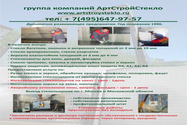 Группа компаний АртСтройСтекло предлагает: Производство стеклопакетов для окон, дверей, витрин, фасадов - за 1 день. Самовывоз стеклопакетов - круглосуточно- г. Балашиха. . ул. Советская 31 (29) . есть доставка и установка стеклопакетов. Для расчета стоимости изготовления стеклопакетов звоните по указанному номеру - заранее - указывайте - размер, и толщину требуемых стеклопакетов.