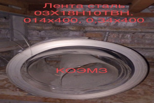 КОЭМЗ продает: нержавеющую ленту сталь 03Х18Н10ТВН. *Сталь 03Х18Н10ТВН: -Лента 0,14х400мм. В наличии 899,4 кг. Вес бухт, кг - 63,75. 835,65. -Лента 0,34х400мм. В наличии 2172,4 кг. Вес бухт, кг - 778. 869,4. 80. 154. 291. Подробности по телефону или на сайте: