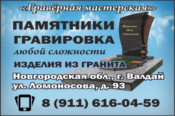 "Гравёрная мастерская" производит: - Обработка природного камня, производство ритуальных изделий (памятники, надгробия, гранитные комплексы) - Бытовые изделия из гранита (столешницы, каминные полки, балясины и т. д. ). Многолетний опыт (с 1999 г. ) и техническая база позволяют реализовывать проекты практически любой сложности. Весь комплекс услуг - проектирование, резка, полировка, гравировка любой сложности, - производится своими силами, в одном месте (в нашей мастерской). Также имеется услуга по монтажу памятника непосредственно на кладбищах города и района. Новгородская область, г. Валдай, ул. Ломоносова, д. 93