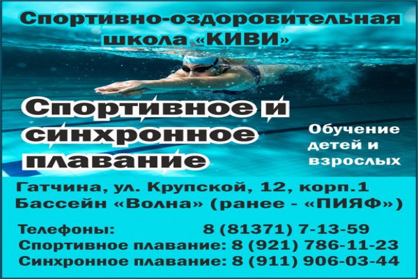 Школа "КИВИ" организована в 1993 году и специализируется по двум направлениям: синхронное и спортивное плавание. СОШ "КИВИ" является ведущей школой в Ленинградской области, культивирующей синхронное плавание и формирующей сборную команду области. Спортсмены школы принимают участия в Первенствах, Чемпионатах России, Спартакиадах школьников России и международных соревнованиях. В спортивном плавании акцент ставится на гарантированное обучение детей в течение трех месяцев. Проводится обучение плаванию различными стилями взрослых и детей, участие в соревнованиях. Адрес бассейна в центре физической культуры и спорта "Волна" (ранее - бассейн “ПИЯФ”): Ленинградская обл., г. Гатчина, ул. Крупской, д. 12, корп. 1